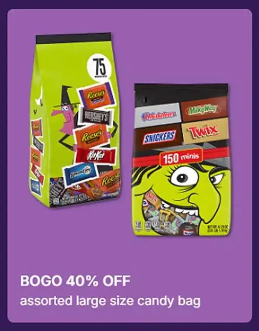 Hurry in and buy one, get one 40% off assorted large size candy bag in store.