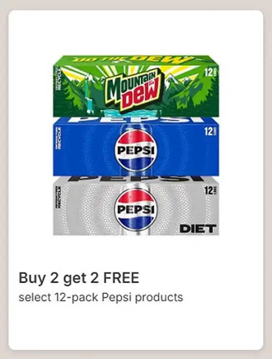 Hurry in and buy 2, get 2 free select 12-pack Pepsi products in store.